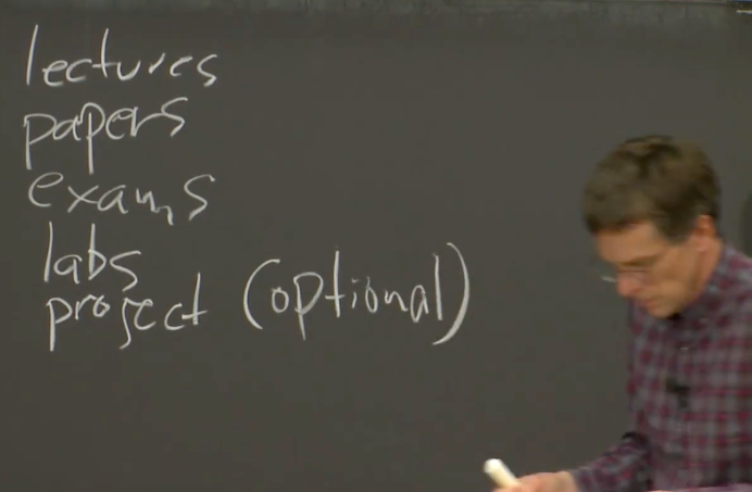 授课内容会围绕分布式系统的两个方面(性能和容错)。有几节课会介绍一些关于编程实验的内容。许多课程我们将会以案例分析为主要形式。我会在课前提供一些关于分布式系统的论文,这些论文有些是学术研究,也有一些是工业界关于现实问题的解决方案。授课内容会被录像并被上传到网络,这样不在课堂的人也可以在别的地方观看视频,同时你们也可以回顾课程视频。