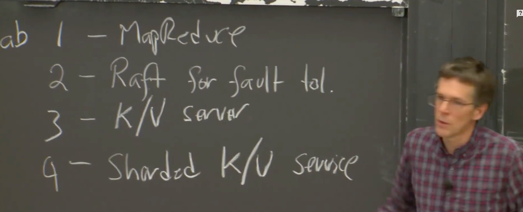 有四次编程实验。第一次实验需要在下周五前完成,这是一个简单的MapReduce实验。你们要根据你们在论文中读到的来实现你们版本的MapReduce。我们过一会就会讨论这个论文。第二个实验实现Raft算法,这是一个理论上通过复制来让系统容错的算法,具体是通过复制和出现故障时自动切换来实现。第三个实验,你需要使用你的Raft算法实现来建立一个可以容错的KV服务。第四个实验,你需要把你写的KV服务器分发到一系列的独立集群中,这样你会切分你的KV服务,并通过运行这些独立的副本集群进行加速。同时,你也要负责将不同的数据块在不同的服务器之间搬迁,并确保数据完整。这里我们通常称之为分片式KV服务。分片是指我们将数据在多个服务器上做了分区,来实现并行的加速。