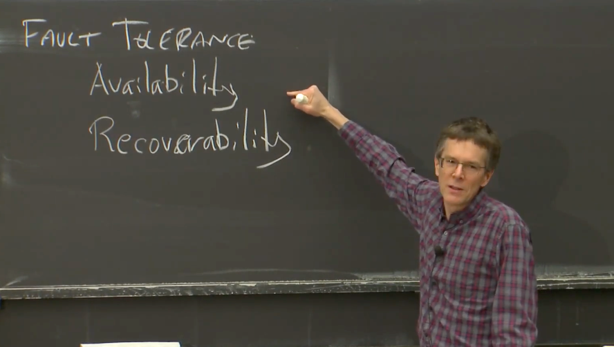 对于一个可恢复的系统,通常需要做一些操作,例如将最新的数据存放在磁盘中,这样在供电恢复之后(假设故障就是断电),才能将这些数据取回来。甚至说对于一个具备可用性的系统,为了让系统在实际中具备应用意义,也需要具备可恢复性。因为可用的系统仅仅是在一定的故障范围内才可用,如果故障太多,可用系统也会停止工作,停止一切响应。但是当足够的故障被修复之后,系统还是需要能继续工作。所以,一个好的可用的系统,某种程度上应该也是可恢复的。当出现太多故障时,系统会停止响应,但是修复之后依然能正确运行。这是我们期望看到的。