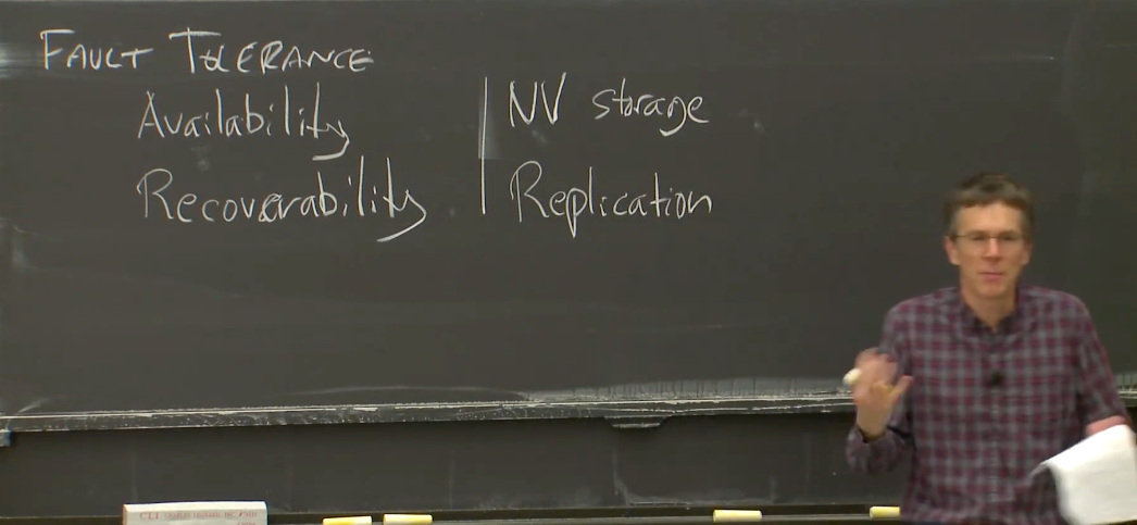 - 一个是非易失存储(non-volatile storage,类似于硬盘)。这样当出现类似电源故障,甚至整个机房的电源都故障时,我们可以使用非易失存储,比如硬盘,闪存,SSD之类的。我们可以存放一些checkpoint或者系统状态的log在这些存储中,这样当备用电源恢复或者某人修好了电力供给,我们还是可以从硬盘中读出系统最新的状态,并从那个状态继续运行。所以,这里的一个工具是非易失存储。因为更新非易失存储是代价很高的操作,所以相应的出现了很多非易失存储的管理工具。同时构建一个高性能,容错的系统,聪明的做法是避免频繁的写入非易失存储。在过去,甚至对于今天的一个3GHZ的处理器,写入一个非易失存储意味着移动磁盘臂并等待磁碟旋转,这两个过程都非常缓慢。有了闪存会好很多,但是为了获取好的性能,仍然需要许多思考。