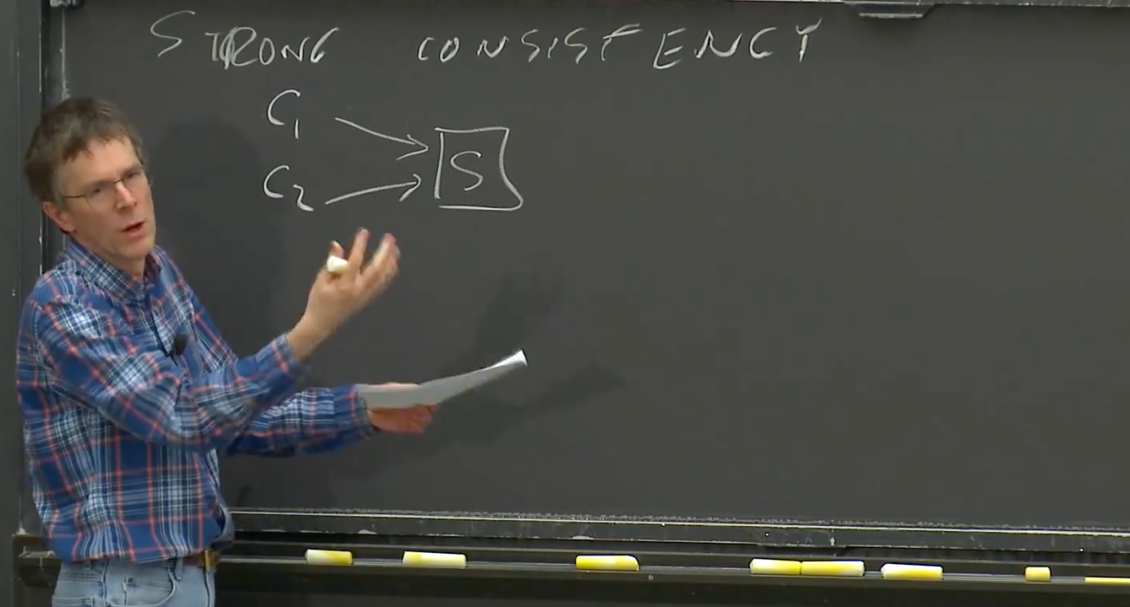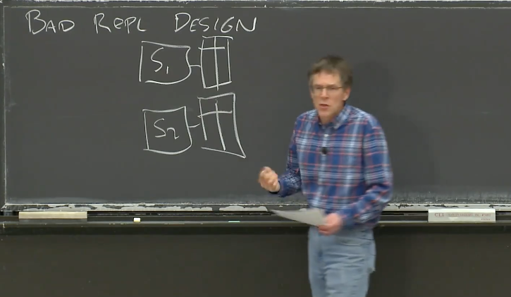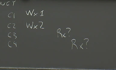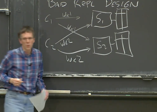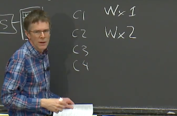 Robert教授:这是个好问题。在这里,我假设C1和C2在同一时间发起请求。所以,如果我们在监控网络的话,我们可以看到两个请求同时发往服务器。之后在某个时刻,服务器会响应它们。但是这里没有足够的信息来判断,服务器会以哪种顺序执行这两个写请求。如果服务器先处理了写X为1的请求,那么就意味着它接下来会处理写X为2的请求,所以接下来的读X请求可以看到2。然而,如果服务器先处理了写X为2的请求,再处理写X为1的请求,那么接下来的读X请求看到的就是1。