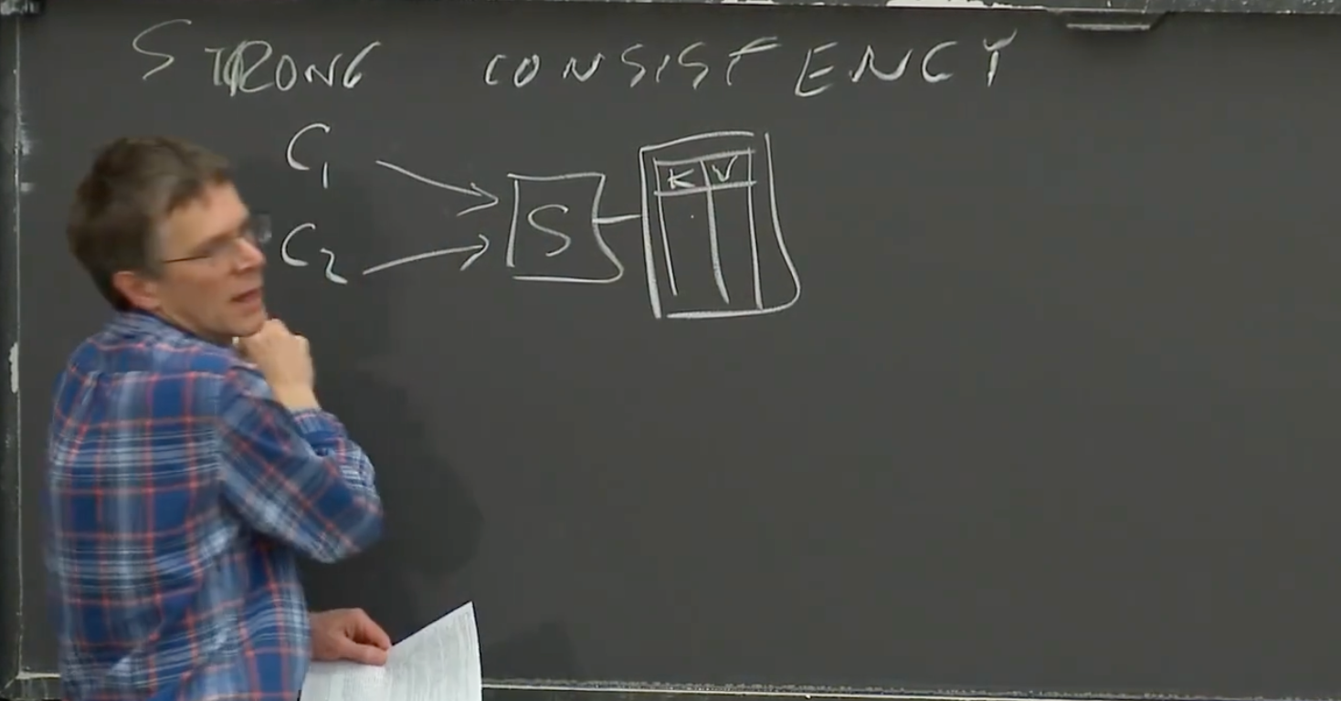 这里说到了一致性,我在后面的课程会对“好”的一致性做更多的介绍(lec6-7)。对于具备强一致或者好的一致性的系统,从应用程序或者客户端看起来就像是和一台服务器在通信。尽管我们会通过数百台计算机构建一个系统,但是对于一个理想的强一致模型,你看到的就像是只有一台服务器,一份数据,并且系统一次只做一件事情。这是一种直观的理解强一致的方式。你可以认为只有一台服务器,甚至这个服务器只运行单线程,它同一时间只处理来自客户端的一个请求。这很重要,因为可能会有大量的客户端并发的发送请求到服务器上。这里要求服务器从请求中挑选一个出来先执行,执行完成之后再执行下一个。