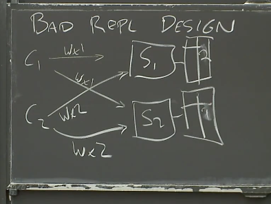 这里有一个几乎是最糟糕的多副本设计,我提出它是为了让你们知道问题所在,并且同样的问题在GFS中也存在。这个设计是这样,我们有两台服务器,每个服务器都有数据的一份完整拷贝。它们在磁盘上都存储了一个key-value表单。当然,直观上我们希望这两个表单是完全一致的,这样,一台服务器故障了,我们可以切换到另一台服务器去做读写。