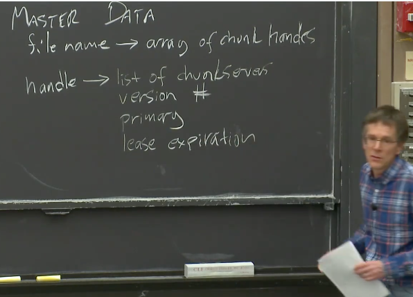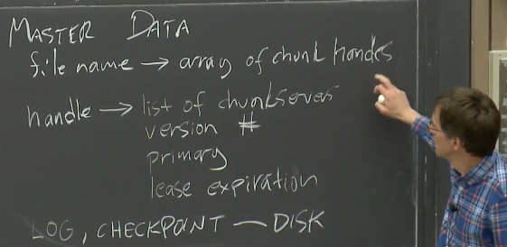 更进一步,我们看一下GFS的一致性以及GFS是如何处理故障。为了了解这些,我们需要知道Master节点内保存的数据内容,这里我们关心的主要是两个表单:
