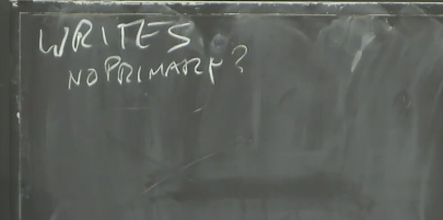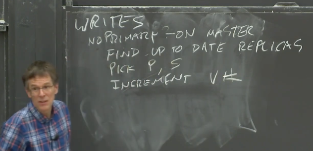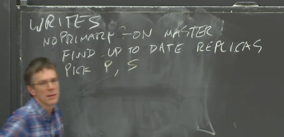 Robert教授:这个问题很好。我不知道答案,不过论文中有一些线索。其实刚刚我的介绍有一些错误,我认为你的问题让我明白了一些事情。GFS论文说,如果Master节点重启,并且与Chunk服务器交互,同时一个Chunk服务器重启,并上报了一个比Master记住的版本更高的版本。Master会认为它在分配新的Primary服务器时出现了错误,并且会使用这个更高的版本号来作为Chunk的最新版本号。