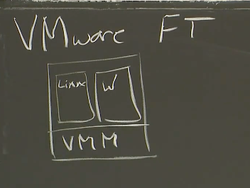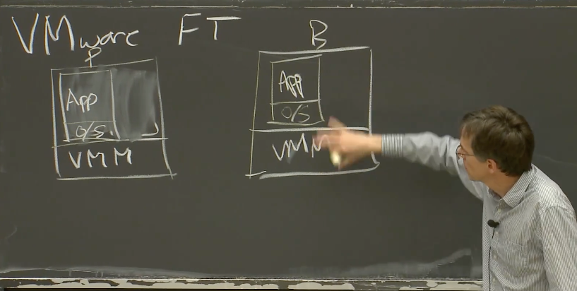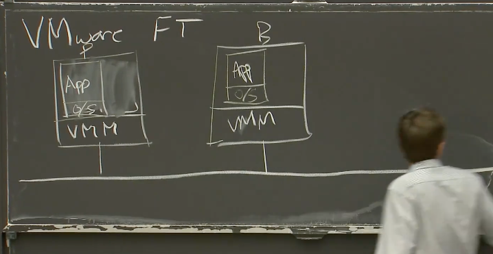 VMware FT需要两个物理服务器。将Primary和Backup运行在一台服务器的两个虚拟机里面毫无意义,因为容错本来就是为了能够抵御硬件故障。所以,你至少需要两个物理服务器运行VMM,Primary虚机在其中一个物理服务器上,Backup在另一个物理服务器上。在其中一个物理服务器上,我们有一个虚拟机,这个物理服务器或许运行了很多虚拟机,但是我们只关心其中一个。这个虚拟机跑了某个操作系统,和一种服务器应用程序,或许是个数据库,或许是MapReduce master或者其他的,我们将之指定为Primary。在第二个物理服务器上,运行了相同的VMM,和一个相同的虚拟机作为Backup。它与Primary有着一样的操作系统。