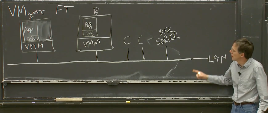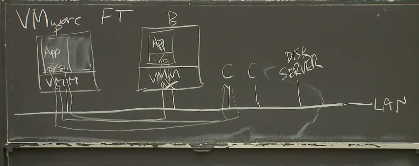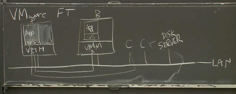 两个物理服务器上的VMM会为每个虚拟机分配一段内存,这两段内存的镜像需要完全一致,或者说我们的目标就是让Primary和Backup的内存镜像完全一致。所以现在,我们有两个物理服务器,它们每一个都运行了一个虚拟机,每个虚拟机里面都有我们关心的服务的一个拷贝。我们假设有一个网络连接了这两个物理服务器。