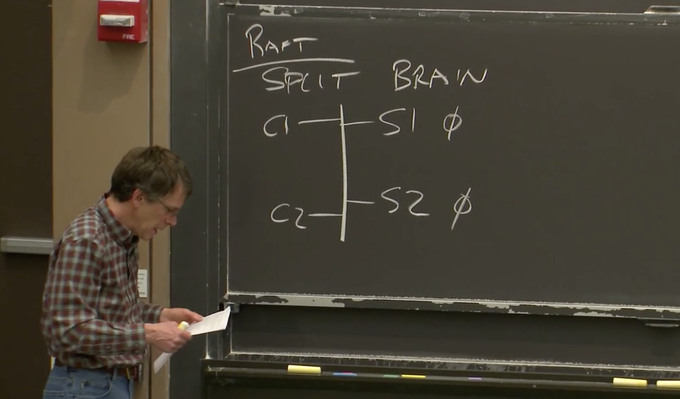但是同时,S2里面的状态仍然是0。所以如果现在C2也发送了一个Test-and-Set请求,本来应该发送给两个服务器,但是现在从C2看来,S1不能访问,根据之前定义的规则,那就发送给S2吧。同样的C2也会认为自己持有了锁。如果这个Test-and-Set服务被VMware FT使用,那么这两个VMware 虚机都会认为自己成为了主虚拟机而不需要与另一个虚拟机协商,所以这是一个错误的场景。