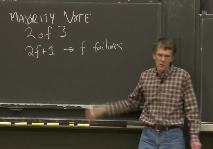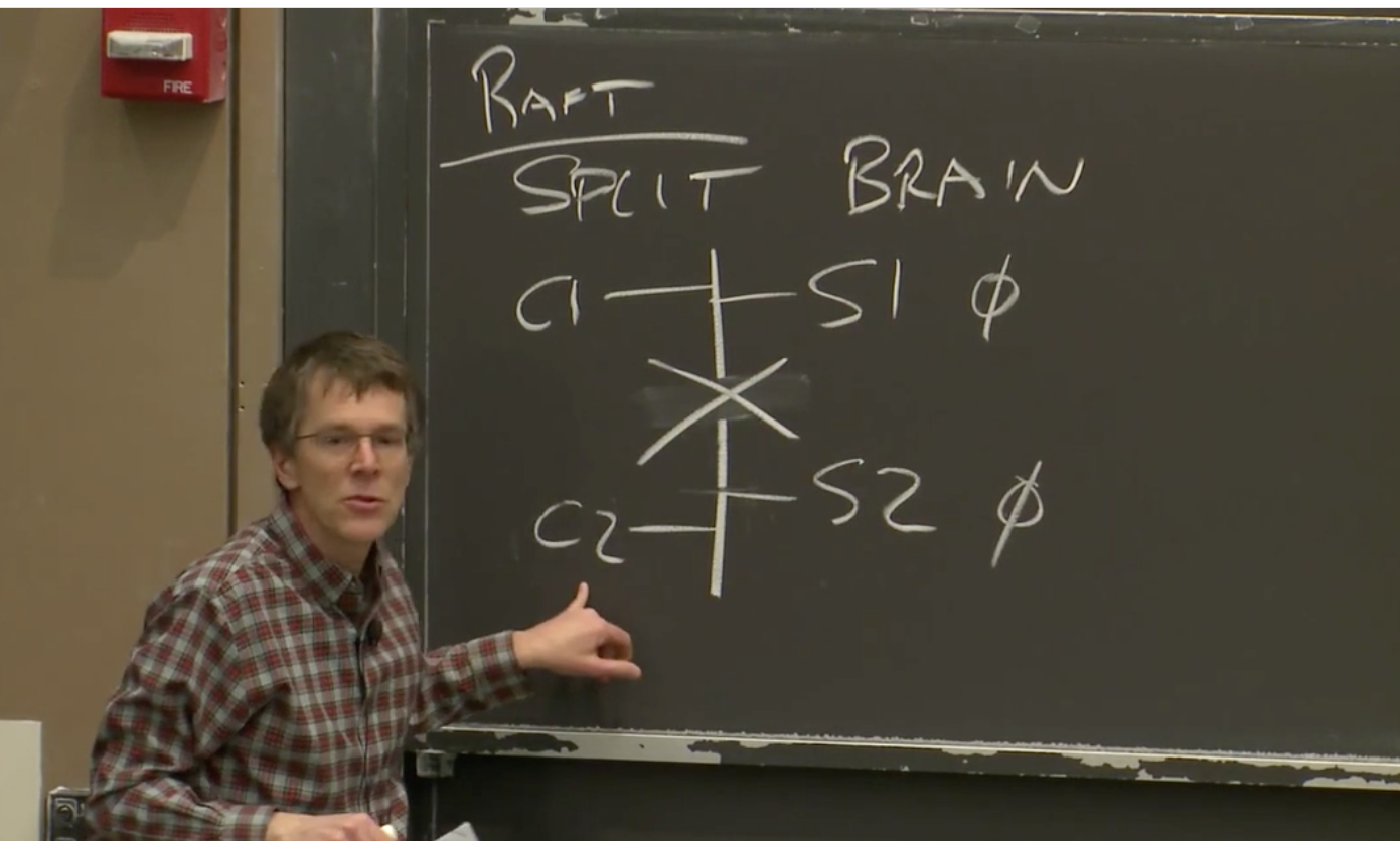 这里有一点需要明确,当我们在说过半的时候,我们是在说所有服务器数量的一半,而不是当前开机服务器数量的一半。这个点困扰了我(Robert教授)很长时间。如果你有一个系统有3个服务器,其中某些已经故障了,如果你要凑齐过半的服务器,你总是需要从3个服务器中凑出2个,即便你知道1个服务器已经因为故障关机了。过半总是相对于服务器的总数来说。