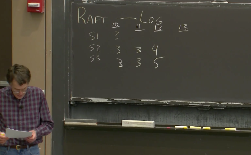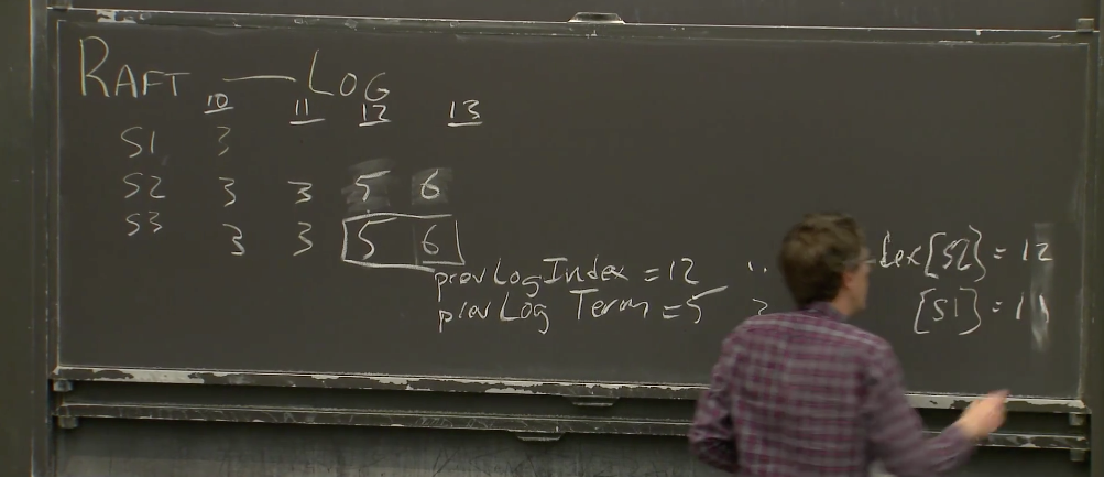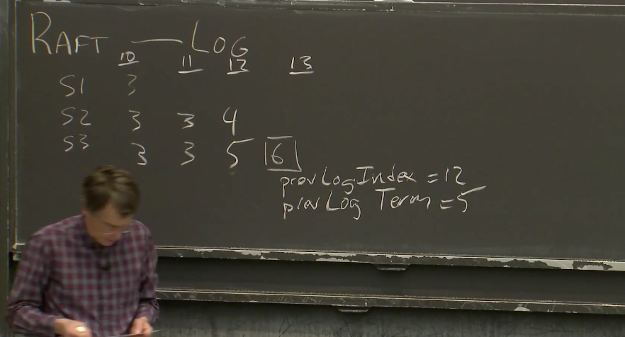 我们假设下一个任期是6。尽管你无法从黑板上确认这一点,但是下一个任期号至少是6或者更大。我们同时假设S3在任期6被选为Leader。在某个时刻,新Leader S3会发送任期6的第一个AppendEntries RPC,来传输任期6的第一个Log,这个Log应该在槽位13。