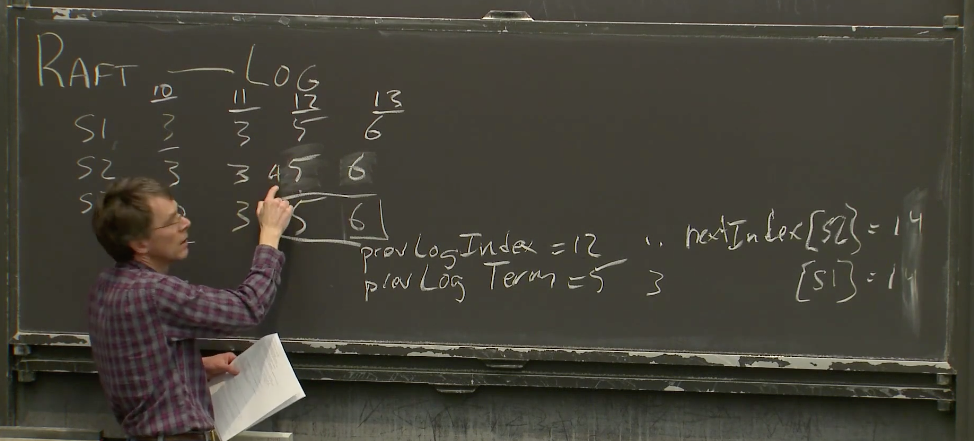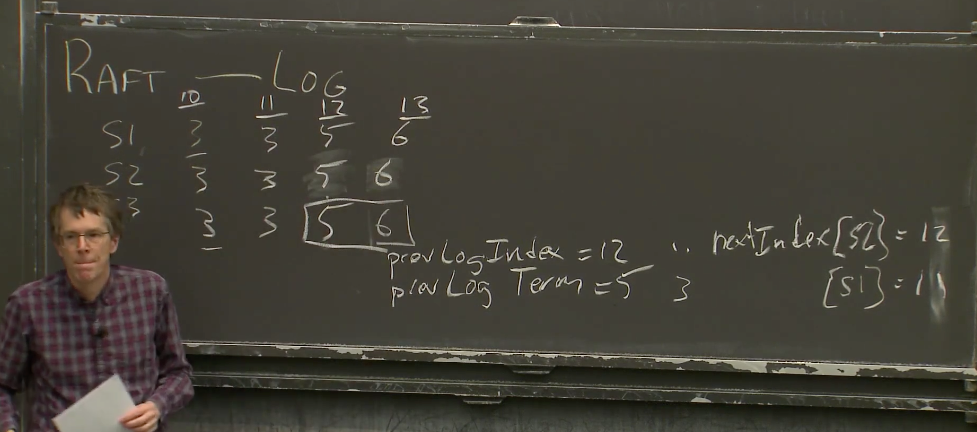 Robert教授:一个备选的答案是,Leader有完整的Log,所以当Leader收到有关AppendEntries的False返回时,它可以发送完整的日志给Follower。如果你刚刚启动系统,甚至在一开始就发生了非常反常的事情,某个Follower可能会从第一条Log 条目开始恢复,然后让Leader发送整个Log记录,因为Leader有这些记录。如果有必要的话,Leader拥有填充每个节点的日志所需的所有信息。