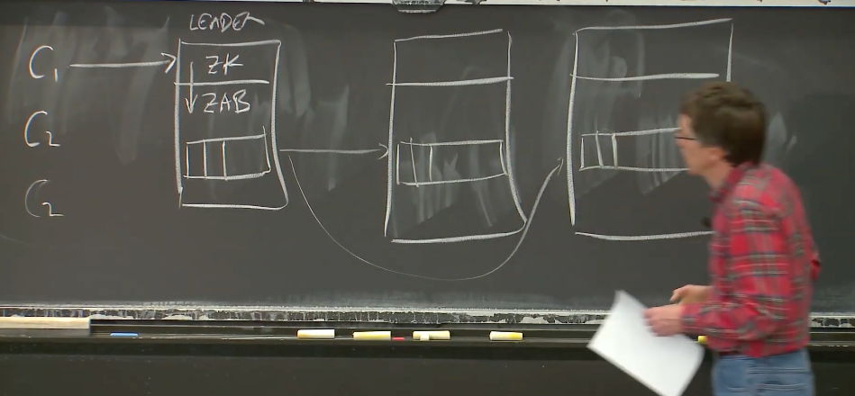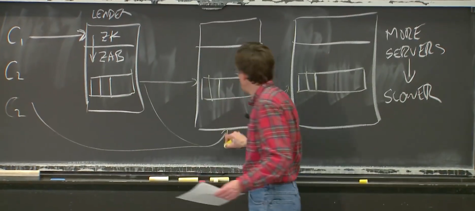 所以,现在全局来看,我们有大量的客户端,或许有数百个客户端,并且我们有一个Leader,这个Leader有两层,上面一层是与客户端交互的Zookeeper,下面是与Raft类似的管理多副本的Zab。Zab所做的工作是维护用来存放一系列操作的Log,这些操作是从客户端发送过来的,这与Raft非常相似。然后会有多个副本,每个副本都有自己的Log,并且会将新的请求加到Log中。这是一个很熟悉的配置(与Raft是一样的)。