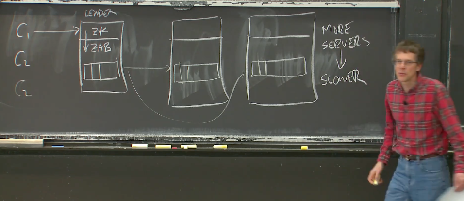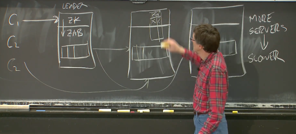 我会先说一下第二个问题。现在这里讨论的是性能,我接下来将会把Zookeeper看成一个类似于Raft的多副本系统。Zookeeper实际上运行在Zab之上,从我们的角度来看,Zab几乎与Raft是一样的。这里我只看多副本系统的性能,我并不关心Zookeeper的具体功能。