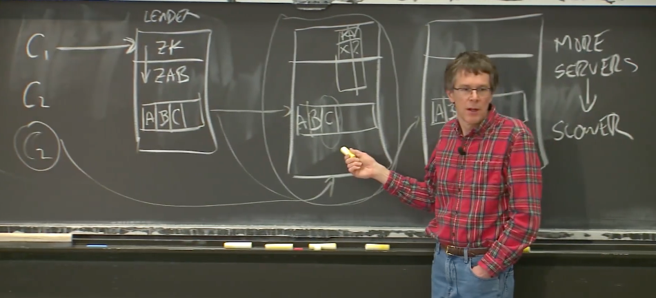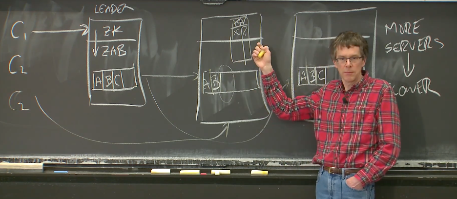 Robert教授:在这样(Zookeeper)一个系统中,要想利用这一点来提升性能是非常受限的。从一个全局角度来看,所有的请求还是发给了Leader,Leader还是要将请求发送给所有的副本,副本越多,Leader需要发送的消息也就越多。所以从一个全局的角度来看,这种交替的请求不太可能帮助这个系统。但是这是个很好的想法,因为它绝对可以用在其他系统中,人们可以在其他系统中利用这个想法。