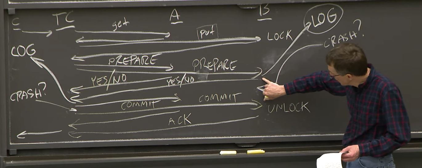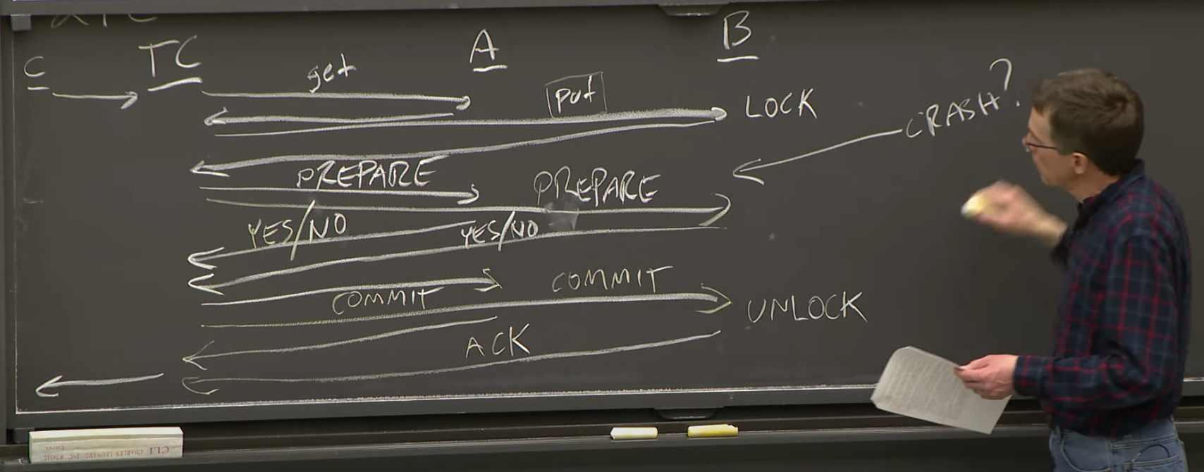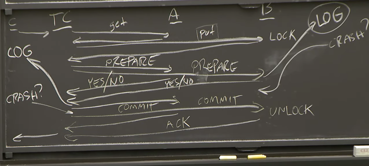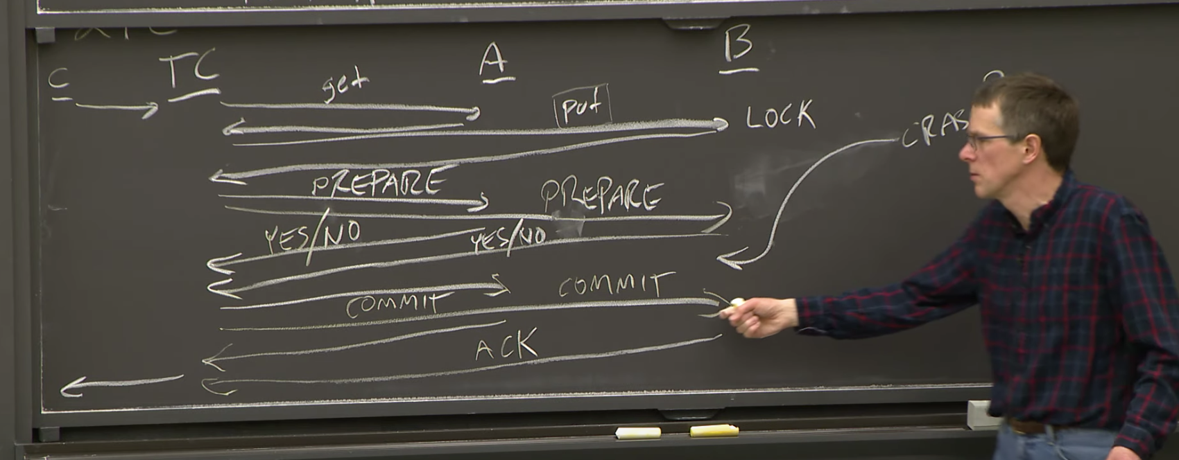 在B回复Prepare之前,它必须确保记住当前事务的中间状态,记住所有要做的修改,记住事务持有的所有的锁,这些信息必须在磁盘上持久化存储。通常来说,这些信息以Log的形式在磁盘上存储。所以在B回复Yes给Prepare消息之前,它首先要将相应的Log写入磁盘,并在Log中记录所有有关提交事务必须的信息。这包括了所有由Put创建的新的数值,和锁的完整列表。之后,B才会回复Yes。