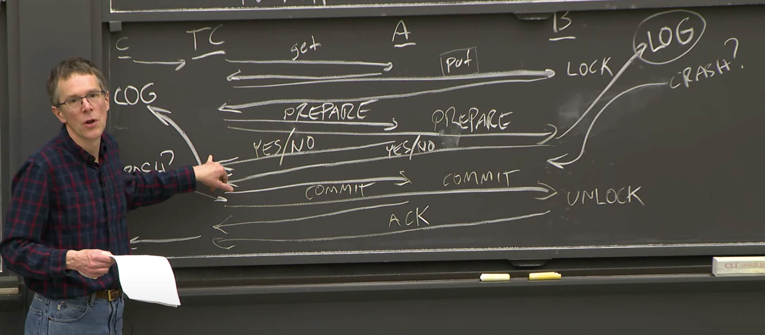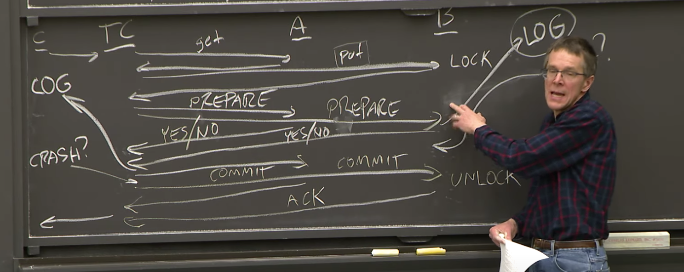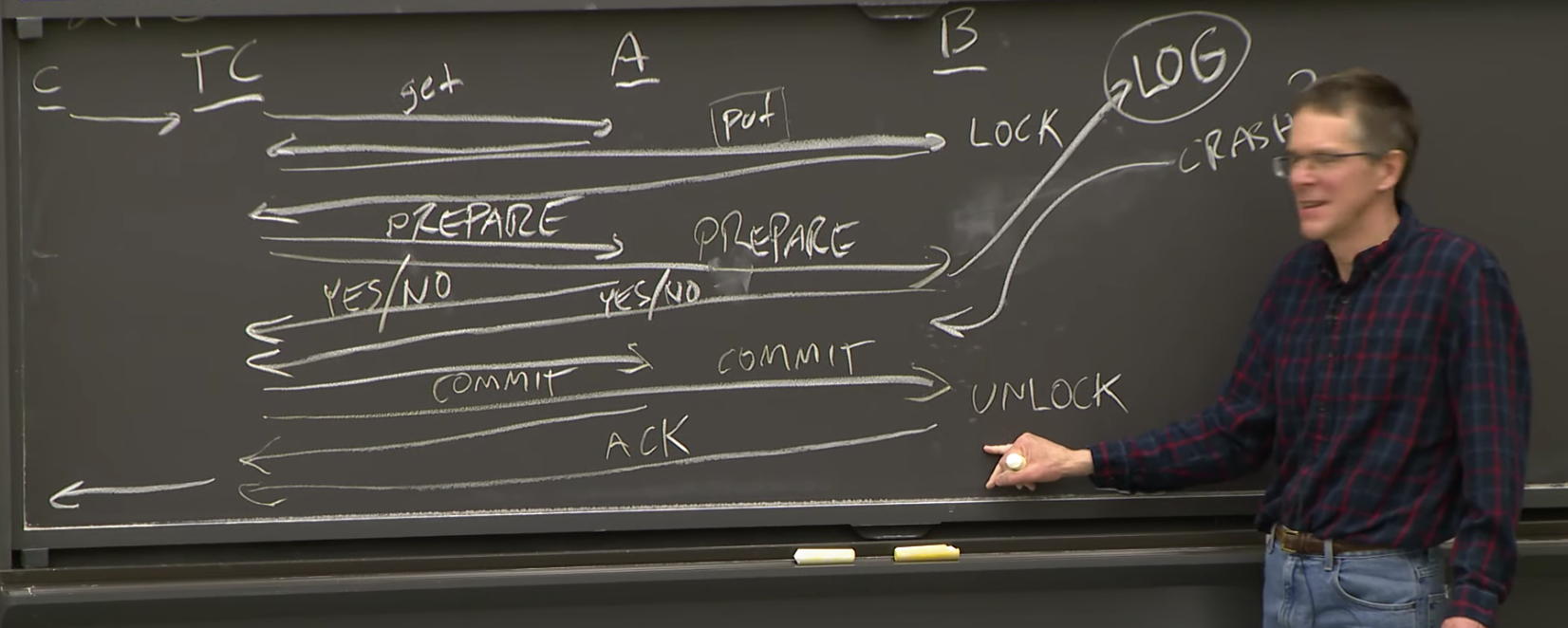 在B回复Prepare之前,它必须确保记住当前事务的中间状态,记住所有要做的修改,记住事务持有的所有的锁,这些信息必须在磁盘上持久化存储。通常来说,这些信息以Log的形式在磁盘上存储。所以在B回复Yes给Prepare消息之前,它首先要将相应的Log写入磁盘,并在Log中记录所有有关提交事务必须的信息。这包括了所有由Put创建的新的数值,和锁的完整列表。之后,B才会回复Yes。