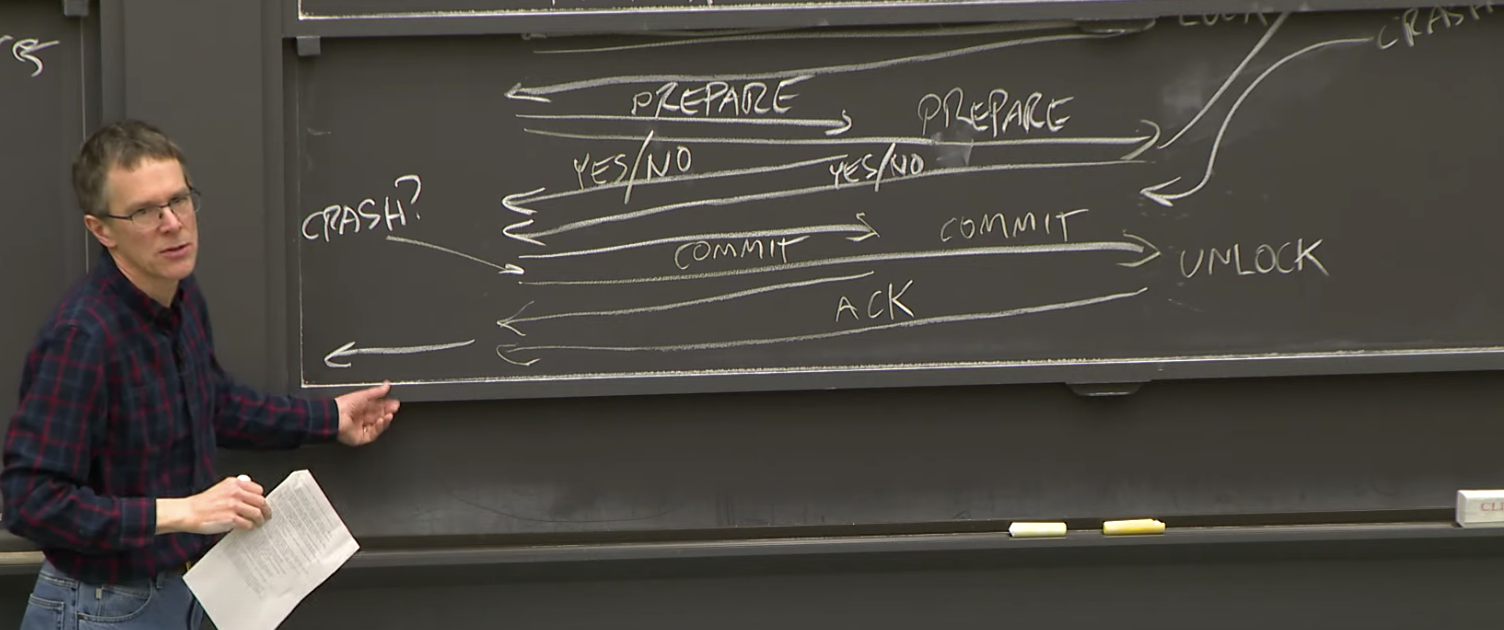 之后,如果B在发送完Yes之后崩溃了,当它重启恢复时,通过查看自己的Log,它可以发现自己正在一个事务的中间,并且对一个事务的Prepare消息回复了Yes。Log里有Commit需要做的所有的修改,和事务持有的所有的锁。之后,当B最终收到了Commit而不是Abort,通过读取Log,B就知道如何完成它在事务中的那部分工作。