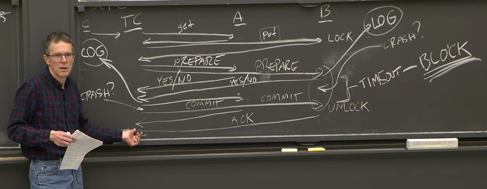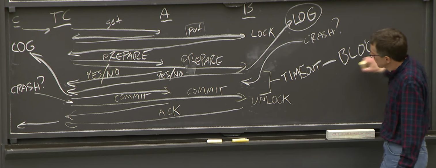 这就是基本的协议。为什么这里的两阶段提交协议能构建一个A和B要么全Commit,要么全Abort的系统?其中一个原因是,决策是在一个单一的实例,也就是事务协调者完成的。A或者B不能决定Commit还是不Commit事务,A和B之间不会交互来达成一致并完成事务的Commit,相反的只有事务协调者可以做决定。事务协调者是一个单一的实例,它会通知其他的部分这是我的决定,请执行它。但是,使用一个单一实例的事务协调者的缺点是,在某个时间点你需要Block并等待事务协调者告诉你决策是什么。