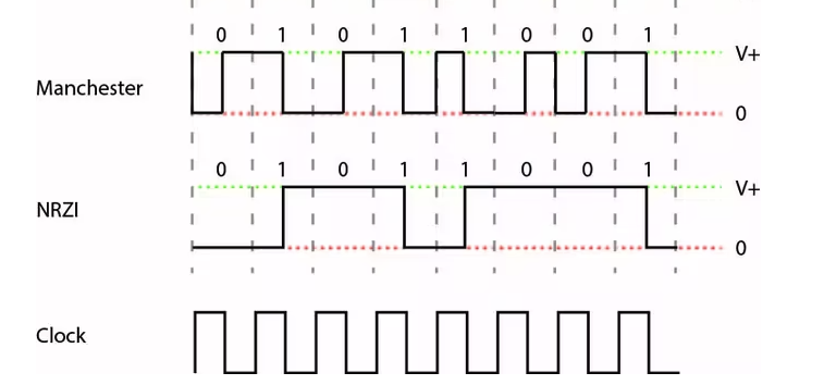 大多数的调制解调方案都有一个关键的需求,那就是可以很容易的实现clock recovery。因为发送端会将信息(也就是bit位)通过时钟周期的触发发送出来,clock recovery是指接收端能够推断(或者是恢复)发送端的时钟频率(注,这样就可以通过发送端的时钟频率判断是否有bit “0”,以及连续的bit “0”有几个)。直观上来看,如果有频繁的0-1和1-0的转变,clock recovery将会很容易。