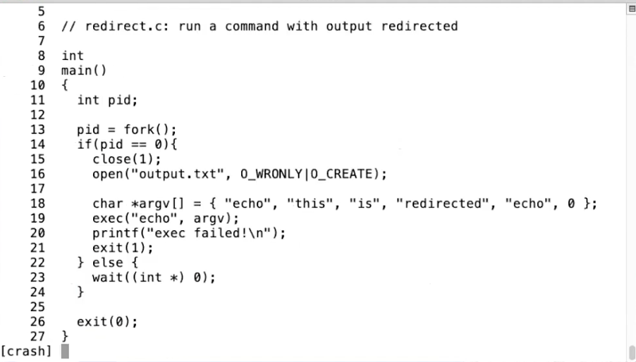 Shell之所以有这样的能力,是因为Shell首先会像第13行一样fork,然后在子进程中,Shell改变了文件描述符。文件描述符1通常是进程用来作为输出的(也就是console的输出文件符),Shell会将文件描述符1改为output文件,之后再运行你的指令。同时,父进程的文件描述符1并没有改变。所以这里先fork,再更改子进程的文件描述符,是Unix中的常见的用来重定向指令的输入输出的方法,这种方法同时又不会影响父进程的输入输出。因为我们不会想要重定向Shell的输出,我们只想重定向子进程的输出。