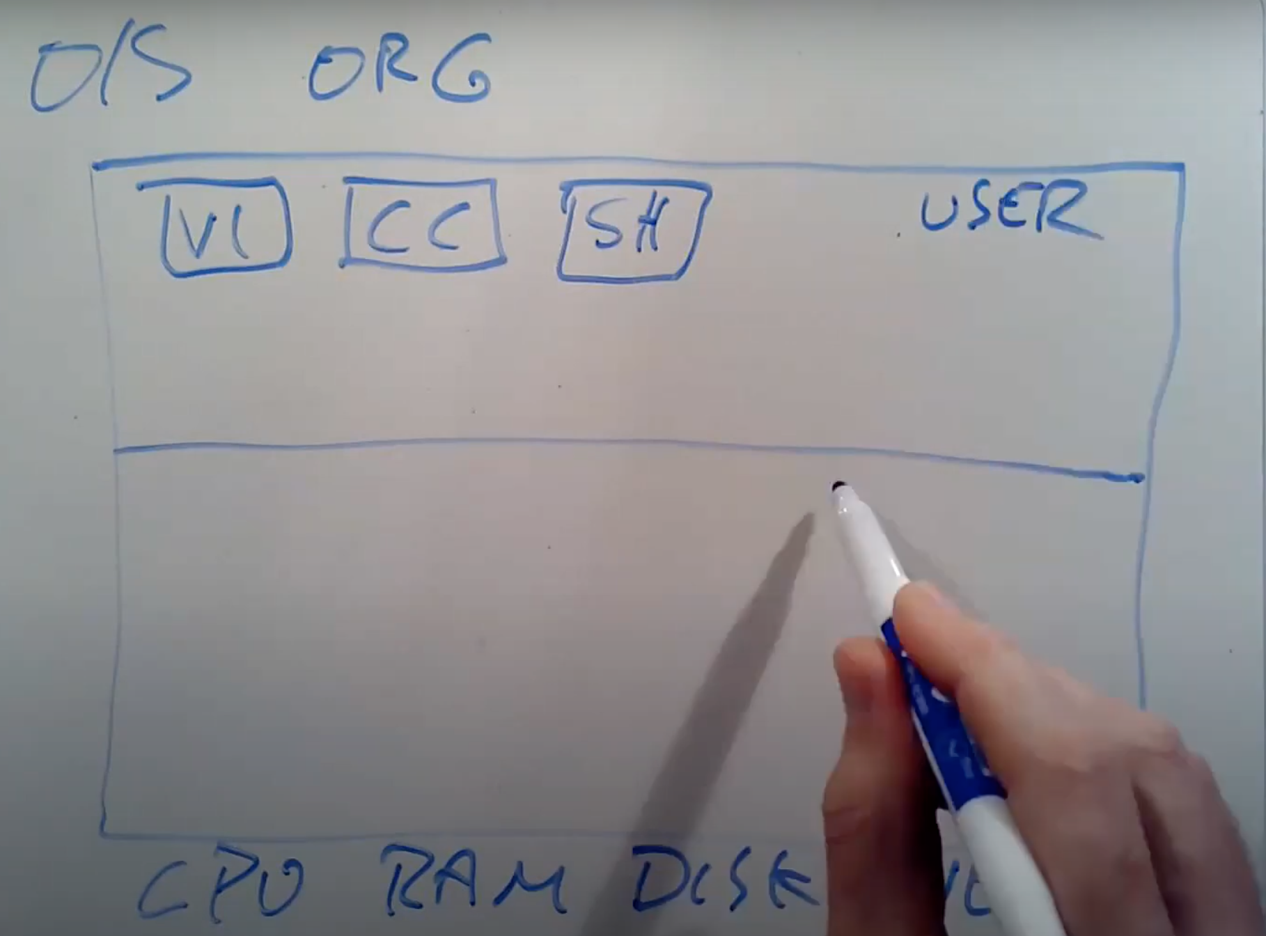在这个架构的最上层,我们会运行各种各样的应用程序,或许有一个文本编辑器(VI),或许有一个C编译器(CC),你还可以运行大量我们今天会讨论的其他事物,例如作为CLI存在的Shell,所以这些就是正在运行的所有程序。这里程序都运行在同一个空间中,这个空间通常会被称为用户空间(Userspace)。