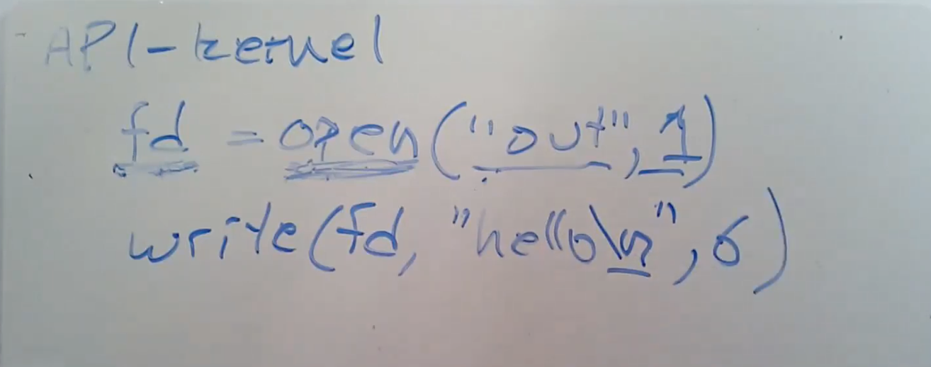这里看起来像是个函数调用,但是open是一个系统调用,它会跳到Kernel,Kernel可以获取到open的参数,执行一些实现了open的Kernel代码,或许会与磁盘有一些交互,最后返回一个文件描述符对象。上图中的fd全称就是file descriptor。之后,应用程序可以使用这个文件描述符作为handle,来表示相应打开的文件。