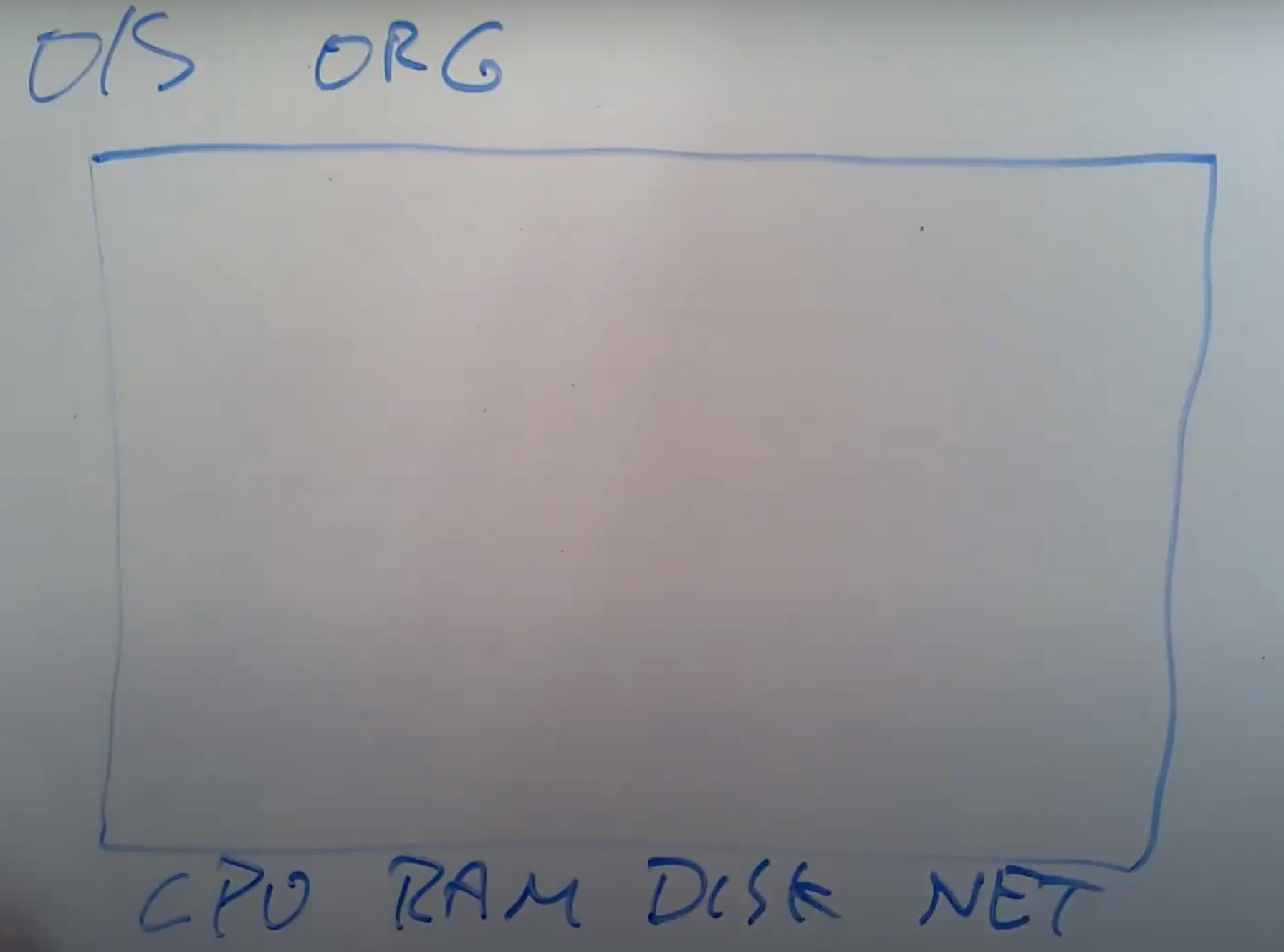这里实际上就是操作系统内部组成,当我想到这里的组织结构时,我首先会想到用一个矩形表示一个计算机,这个计算机有一些硬件资源,我会将它放在矩形的下面,硬件资源包括了CPU,内存,磁盘,网卡。所以硬件资源在最低一层。