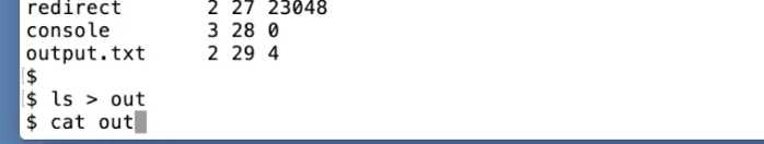 这里的实际意义是,我要求Shell运行ls命令,但是将输出重定向到一个叫做out的文件中。这里执行完成之后我们看不到任何的输出,因为输出都送到了out文件。现在我们知道out文件包含了一些数据,我们可以通过cat指令读取一个文件,并显示文件的内容。