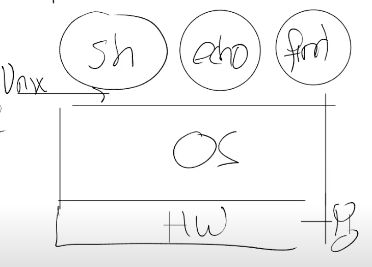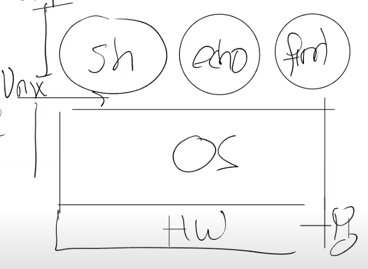 - 首先,会有类似于Shell,echo,find或者任何你实现的工具程序,这些程序运行在操作系统之上。