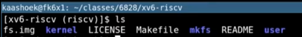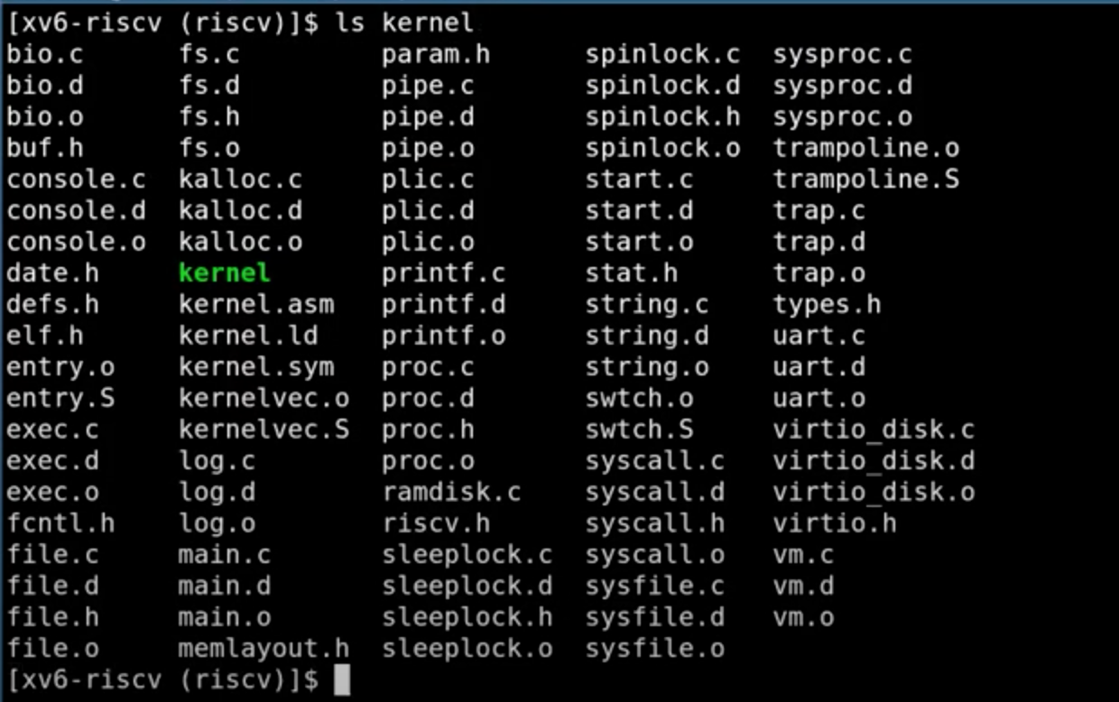 - 第一个是kernel。我们可以ls kernel的内容,里面包含了基本上所有的内核文件。因为XV6是一个宏内核结构,这里所有的文件会被编译成一个叫做kernel的二进制文件,然后这个二进制文件会被运行在kernle mode中。
