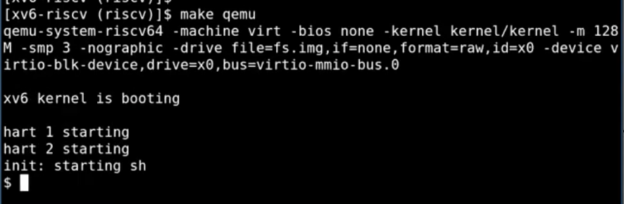 接下来,让我们不带gdb运行XV6(make会读取Makefile文件中的指令)。这里会编译文件,然后调用QEMU(qemu-system-riscv64指令)。这里本质上是通过C语言来模拟仿真RISC-V处理器。