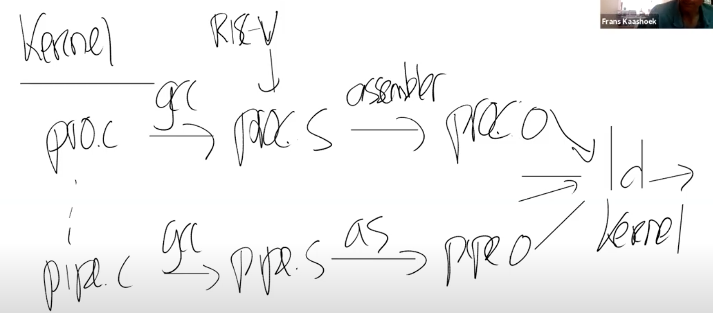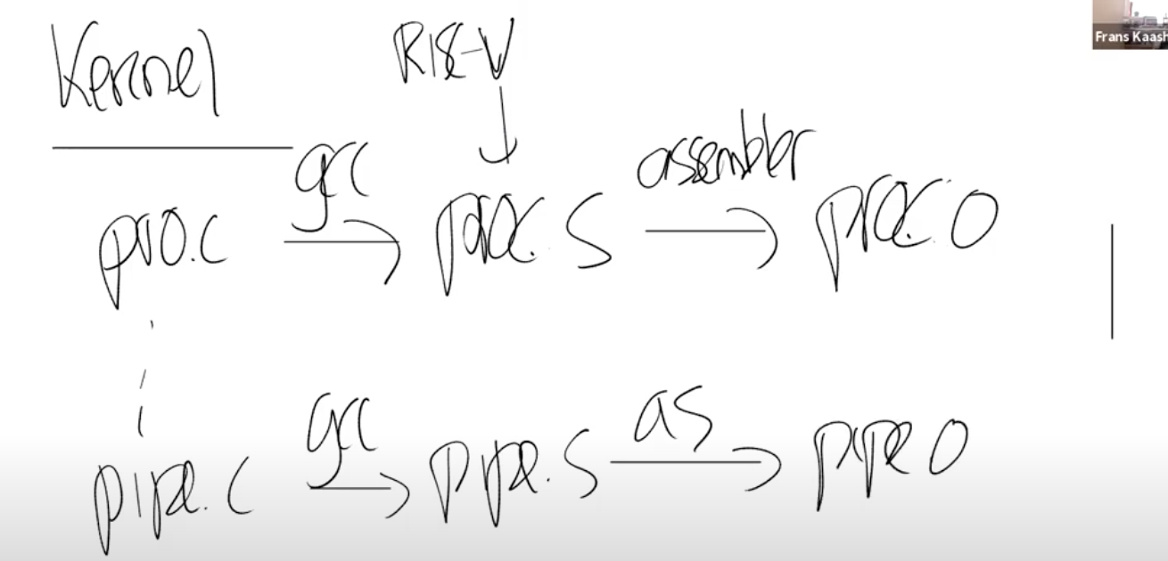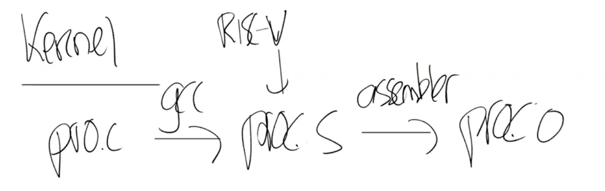 首先,Makefile(XV6目录下的文件)会读取一个C文件,例如proc.c;之后调用gcc编译器,生成一个文件叫做proc.s,这是RISC-V 汇编语言文件;之后再走到汇编解释器,生成proc.o,这是汇编语言的二进制格式。