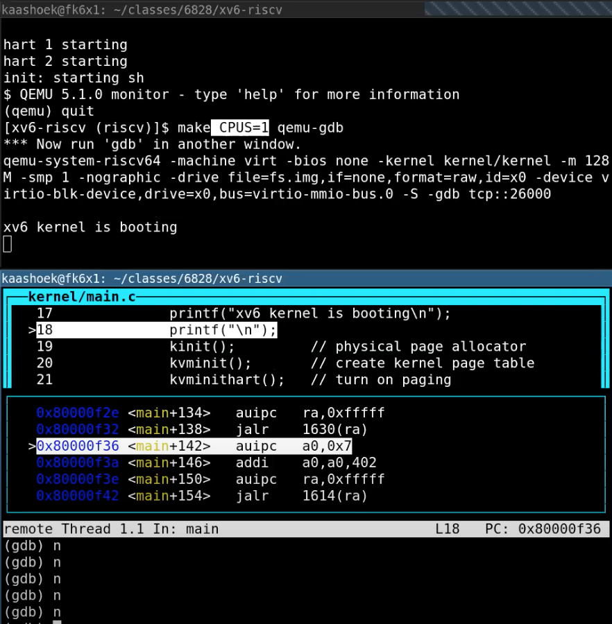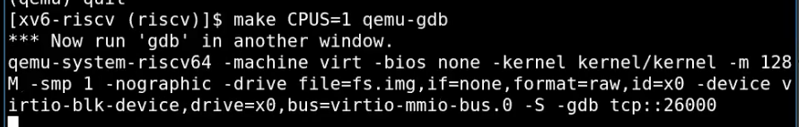 这里我只在一个CPU上运行QEMU(见最初的make参数),这样会使得gdb调试更加简单。因为现在只指定了一个CPU核,QEMU只会仿真一个核,我可以单步执行程序(因为在单核或者单线程场景下,单个断点就可以停止整个程序的运行)。