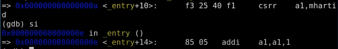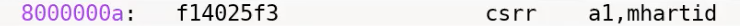 我们可以看到,在地址0x8000000a读取了控制系统寄存器(Control System Register)mhartid,并将结果加载到了a1寄存器。所以QEMU会模拟执行这条指令,之后执行下一条指令。