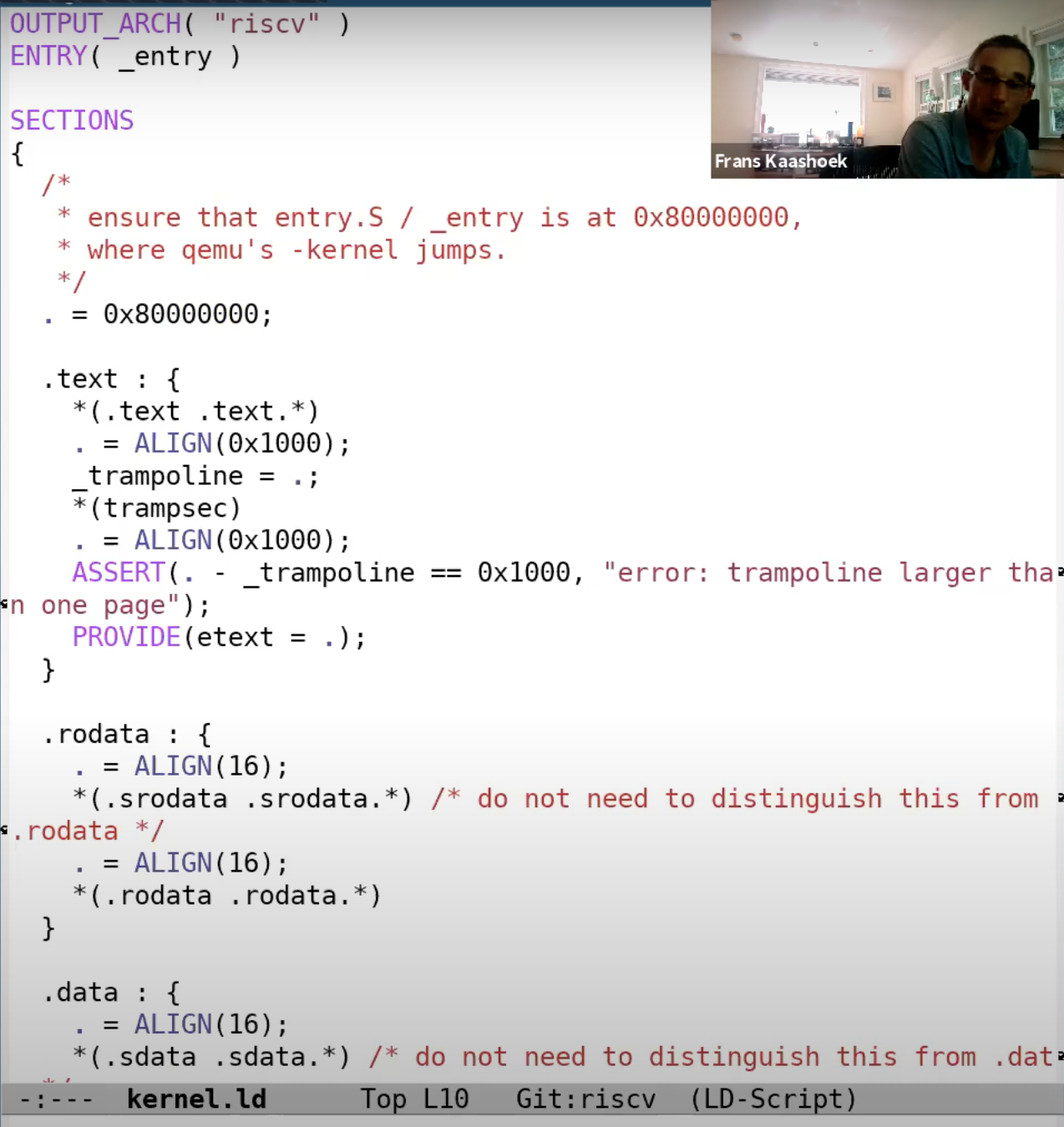 地址0x80000000是一个被QEMU认可的地址。也就是说如果你想使用QEMU,那么第一个指令地址必须是它。所以,我们会让内核加载器从那个位置开始加载内核。如果我们查看kernel.ld,