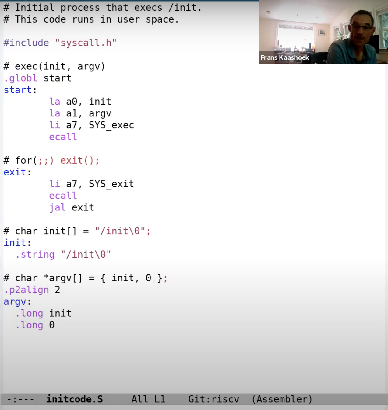 这个汇编程序中,它首先将init中的地址加载到a0(la a0, init),argv中的地址加载到a1(la a1, argv),exec系统调用对应的数字加载到a7(li a7, SYS_exec),最后调用ECALL。所以这里执行了3条指令,之后在第4条指令将控制权交给了操作系统。