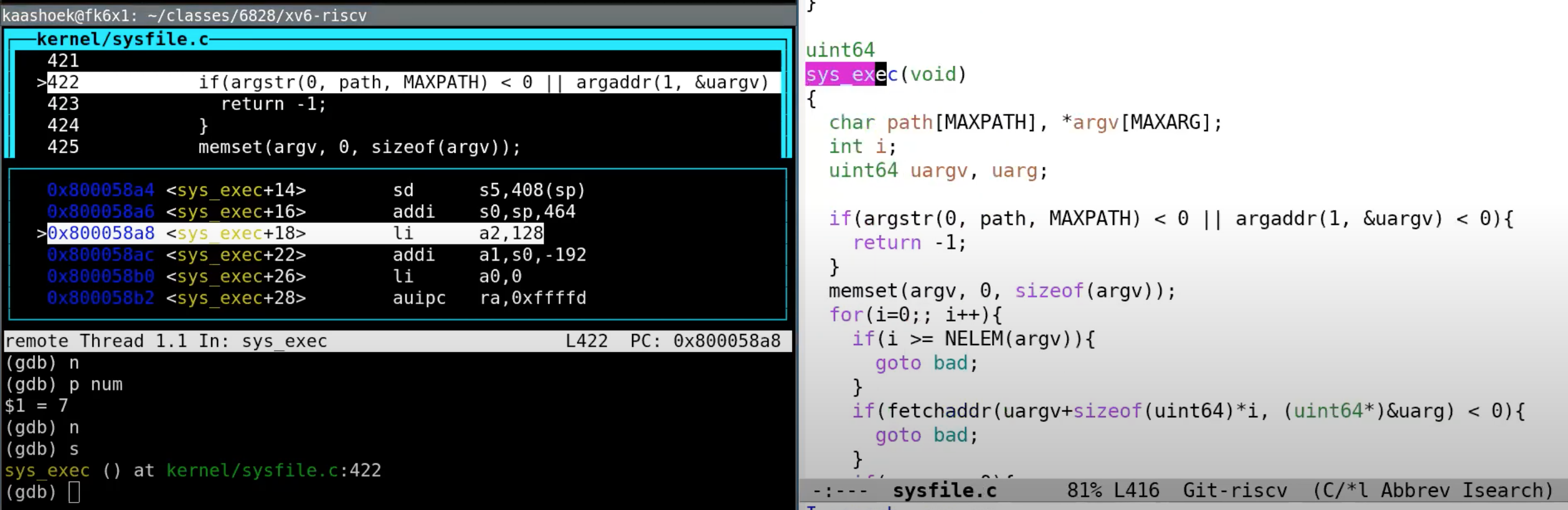 p->trapframe->a0 = syscall[num]() 这一行是实际执行系统调用。这里可以看出,num用来索引一个数组,这个数组是一个函数指针数组,可以预期的是syscall[7]对应了exec的入口函数。我们跳到这个函数中去,可以看到,我们现在在sys_exec函数中。