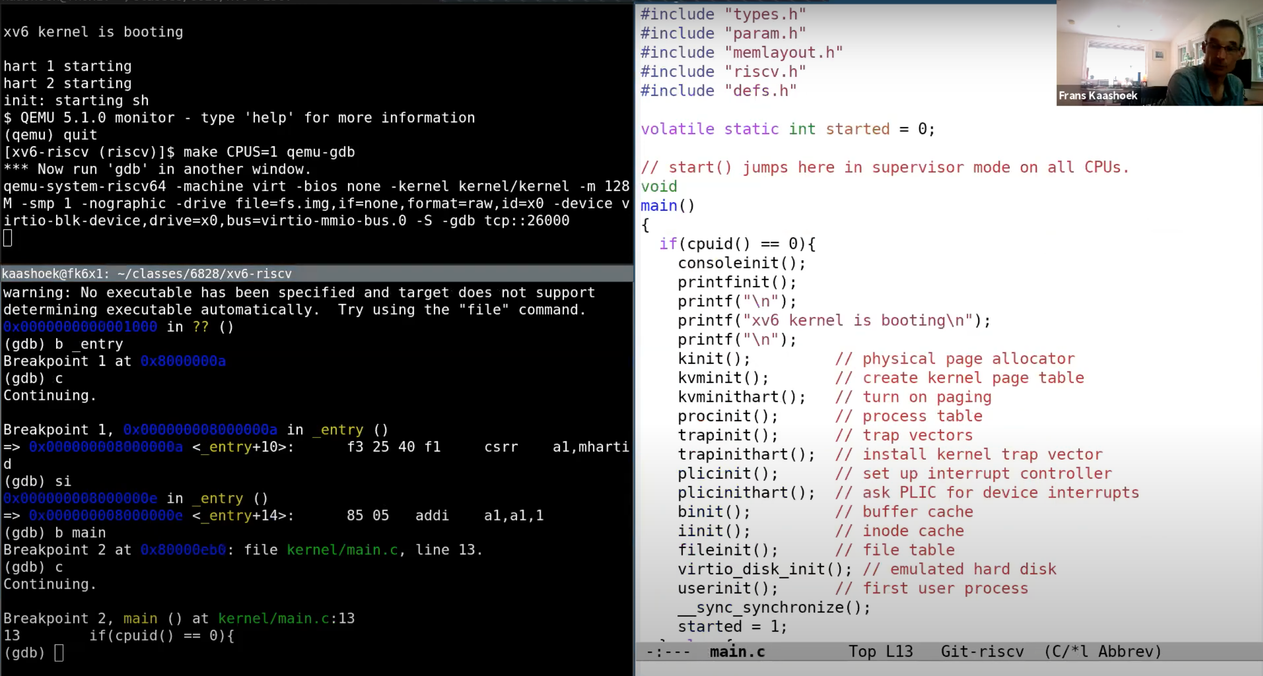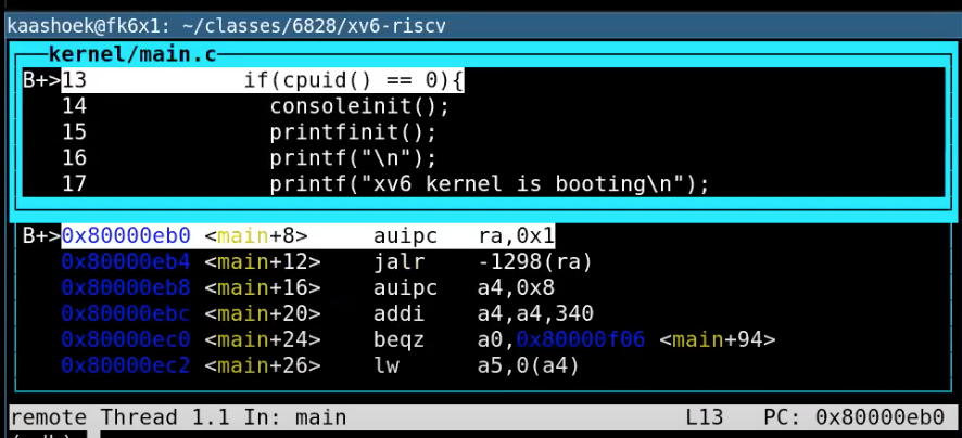 我们这里可以看到,XV6从entry.s开始启动,这个时候没有内存分页,没有隔离性,并且运行在M-mode(machine mode)。XV6会尽可能快的跳转到kernel mode或者说是supervisor mode。我们在main函数设置一个断点,main函数已经运行在supervisor mode了。接下来我运行程序,代码会在断点,也就是main函数的第一条指令停住。