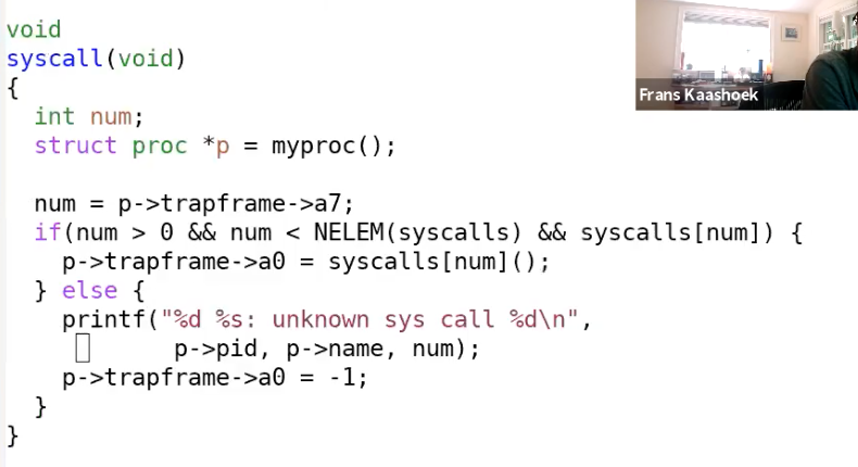 num = p->trapframe->a7 会读取使用的系统调用对应的整数。当代码执行完这一行之后,我们可以在gdb中打印num,可以看到是7。
