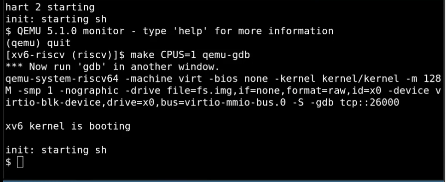 最终的效果就是Shell运行起来了。如果我再次运行代码,我还会陷入到syscall中的断点,并且同样也是调用exec系统调用,只是这次是通过exec运行Shell。当Shell运行起来之后,我们可以从QEMU看到Shell。