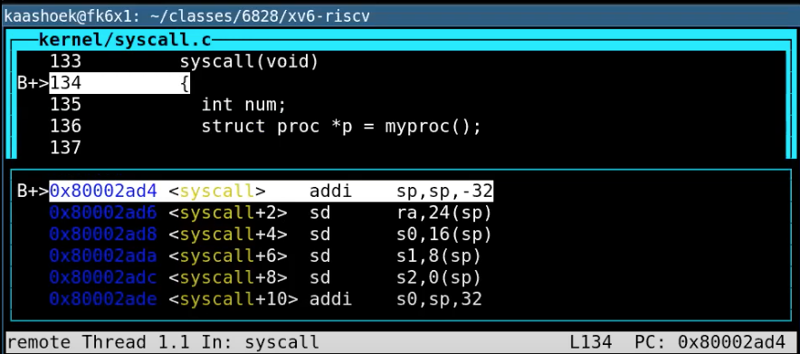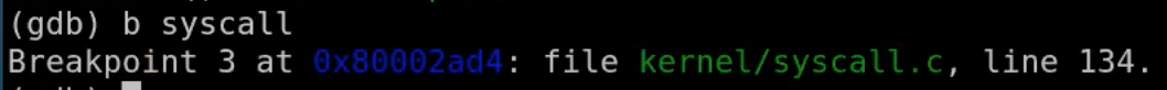 并让程序运行起来。userinit会创建初始进程,返回到用户空间,执行刚刚介绍的3条指令,再回到内核空间。这里是任何XV6用户会使用到的第一个系统调用。让我们来看一下会发生什么。通过在gdb中执行c,让程序运行起来,我们现在进入到了syscall函数。