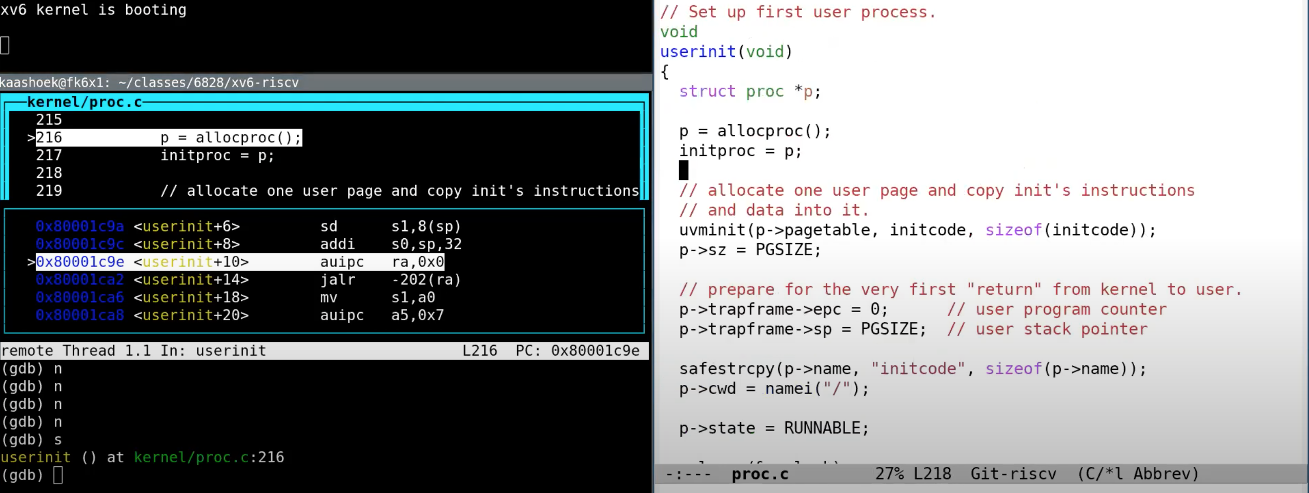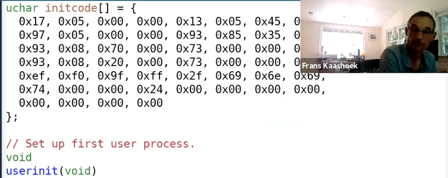 上图是userinit函数,右边是源码,左边是gdb视图。userinit有点像是胶水代码/Glue code(胶水代码不实现具体的功能,只是为了适配不同的部分而存在),它利用了XV6的特性,并启动了第一个进程。我们总是需要有一个用户进程在运行,这样才能实现与操作系统的交互,所以这里需要一个小程序来初始化第一个用户进程。这个小程序定义在initcode中。