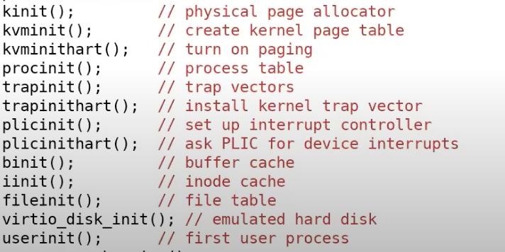 - plicinit/plicinithart:设置好中断控制器PLIC(Platform Level Interrupt Controller),我们后面在介绍中断的时候会详细的介绍这部分,这是我们用来与磁盘和console交互方式