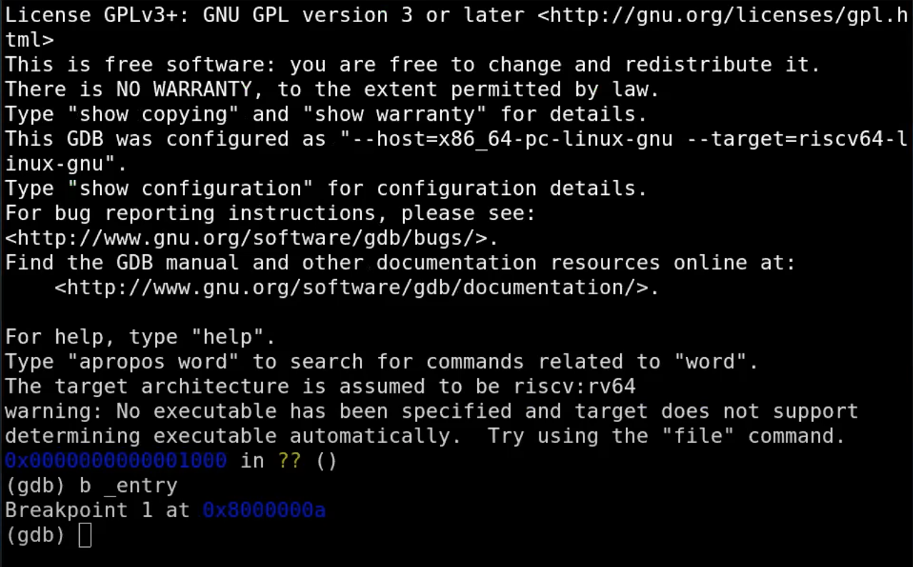 在连接上之后,我会在程序的入口处设置一个端点,因为我们知道这是QEMU会跳转到的第一个指令。