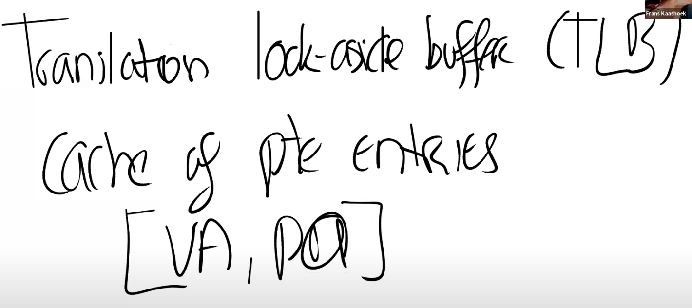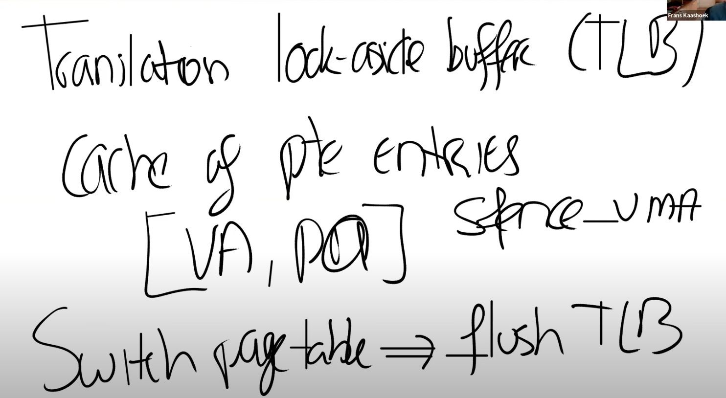 Frans教授:有很多种方法都可以实现TLB,对于你们来说最重要的是知道TLB是存在的。TLB实现的具体细节不是我们要深入讨论的内容。这是处理器中的一些逻辑,对于操作系统来说是不可见的,操作系统也不需要知道TLB是如何工作的。你们需要知道TLB存在的唯一原因是,如果你切换了page table,操作系统需要告诉处理器当前正在切换page table,处理器会清空TLB。因为本质上来说,如果你切换了page table,TLB中的缓存将不再有用,它们需要被清空,否则地址翻译可能会出错。所以操作系统知道TLB是存在的,但只会时不时的告诉操作系统,现在的TLB不能用了,因为要切换page table了。在RISC-V中,清空TLB的指令是sfence_vma。