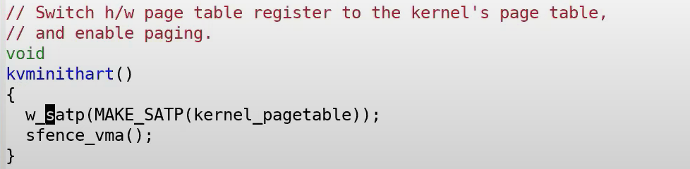 这个函数首先设置了SATP寄存器,kernel_pagetable变量来自于kvminit第一行。所以这里实际上是内核告诉MMU来使用刚刚设置好的page table。当这里这条指令执行之后,下一个指令的地址会发生什么?