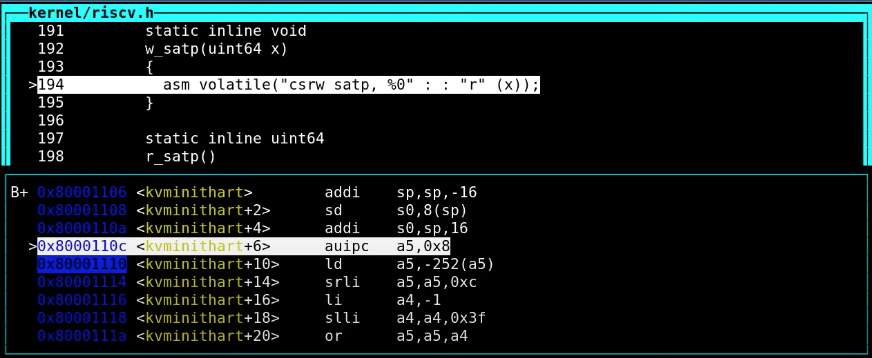 之后,kvminit函数返回了,在main函数中,我们运行到了kvminithart函数。