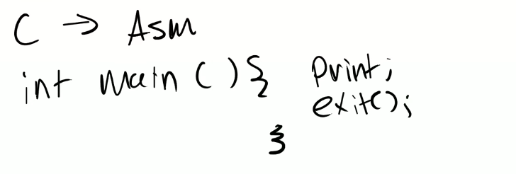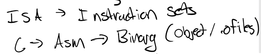 所以通常来说,要让C语言能够运行在你的处理器之上。我们首先要写出C程序,之后这个C程序需要被编译成汇编语言。这个过程中有一些链接和其他的步骤,但是因为这门课不是一个编译器的课程,所以我们忽略这些步骤。之后汇编语言会被翻译成二进制文件也就是.obj或者.o文件。