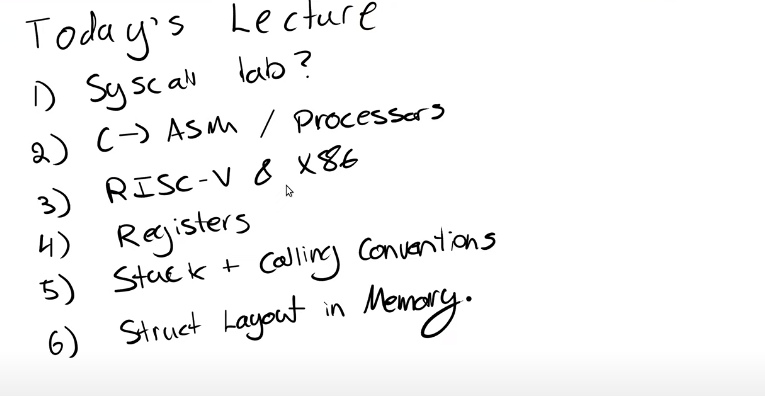今天的课程,我们会稍微讨论C语言转换到汇编语言的过程,以及处理器相关的内容。今天的课程更多偏向的是实际应用,或者至少我们的目标是这样。所以这节课的目标是让你们熟悉RISC-V处理器,汇编语言,以及RISC-V的calling convention。对于page table来说这些内容不太重要,但是对于这周要发布的traps lab来说,这些内容至关重要,因为在这个实验中你们将会频繁用到trapframe(注,XV6中用来实现trap的一个内存page,lecture 6有详细内容)和栈。这些就是今天这节课的主要内容。