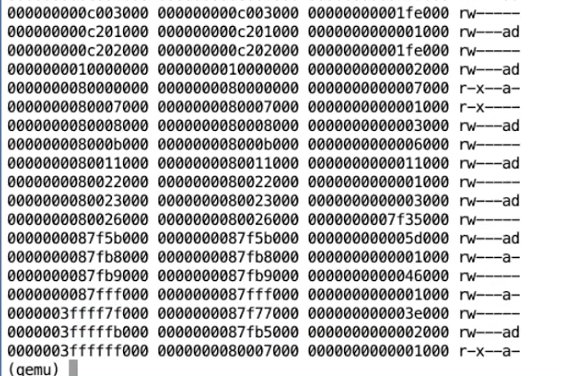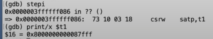 下一条指令是交换SATP和t1寄存器。这条指令执行完成之后,当前程序会从user page table切换到kernel page table。现在我们在QEMU中打印page table,可以看出与之前的page table完全不一样。
